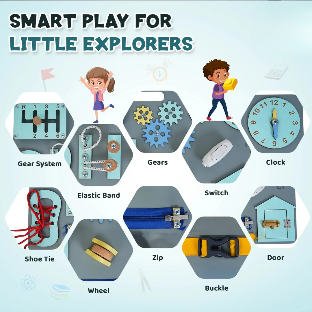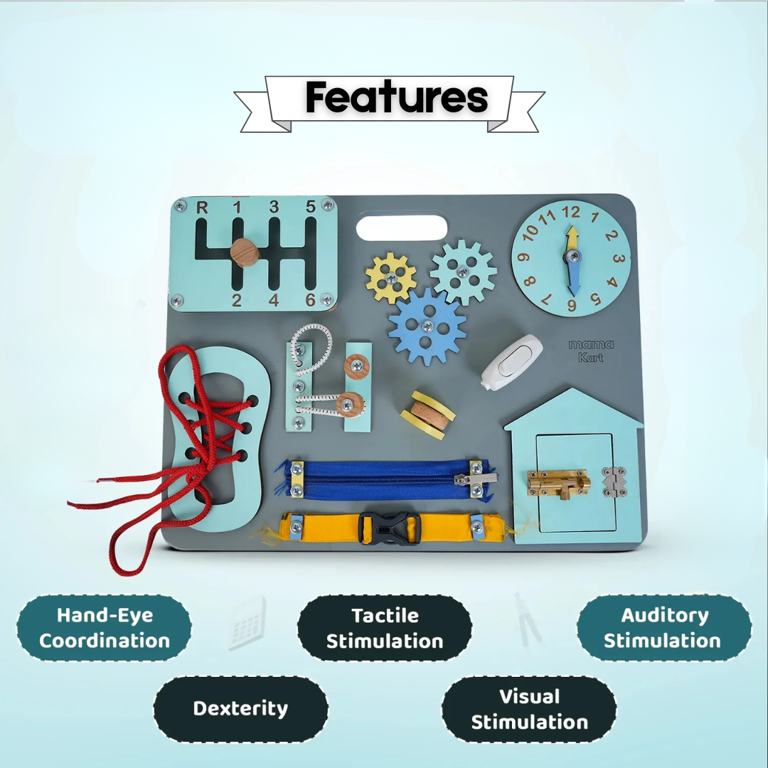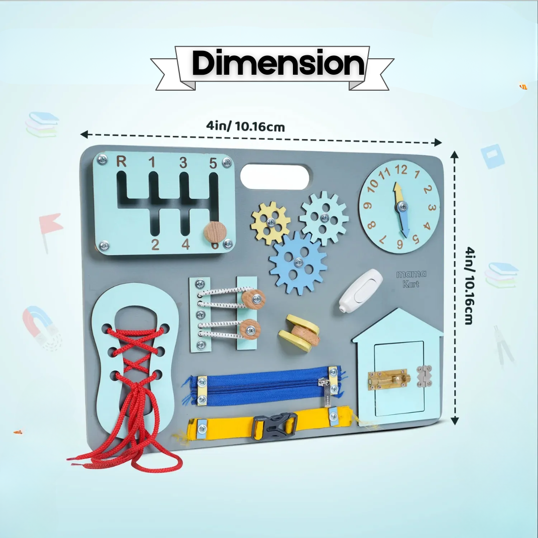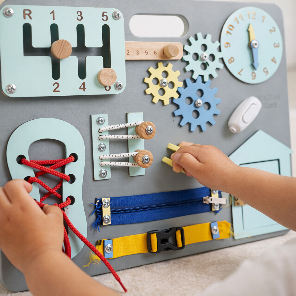A thoughtfully designed activity board packed with everyday tasks that keep little hands busy and curious minds engaged. Through zippers, laces, gears, switches, and locks, children develop fine motor skills, hand–eye coordination, problem-solving, and focus.