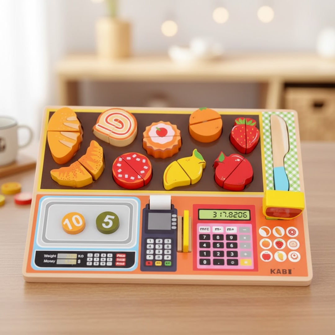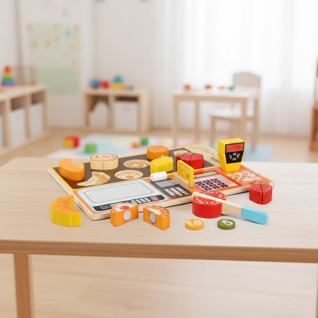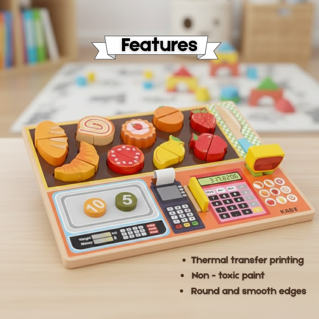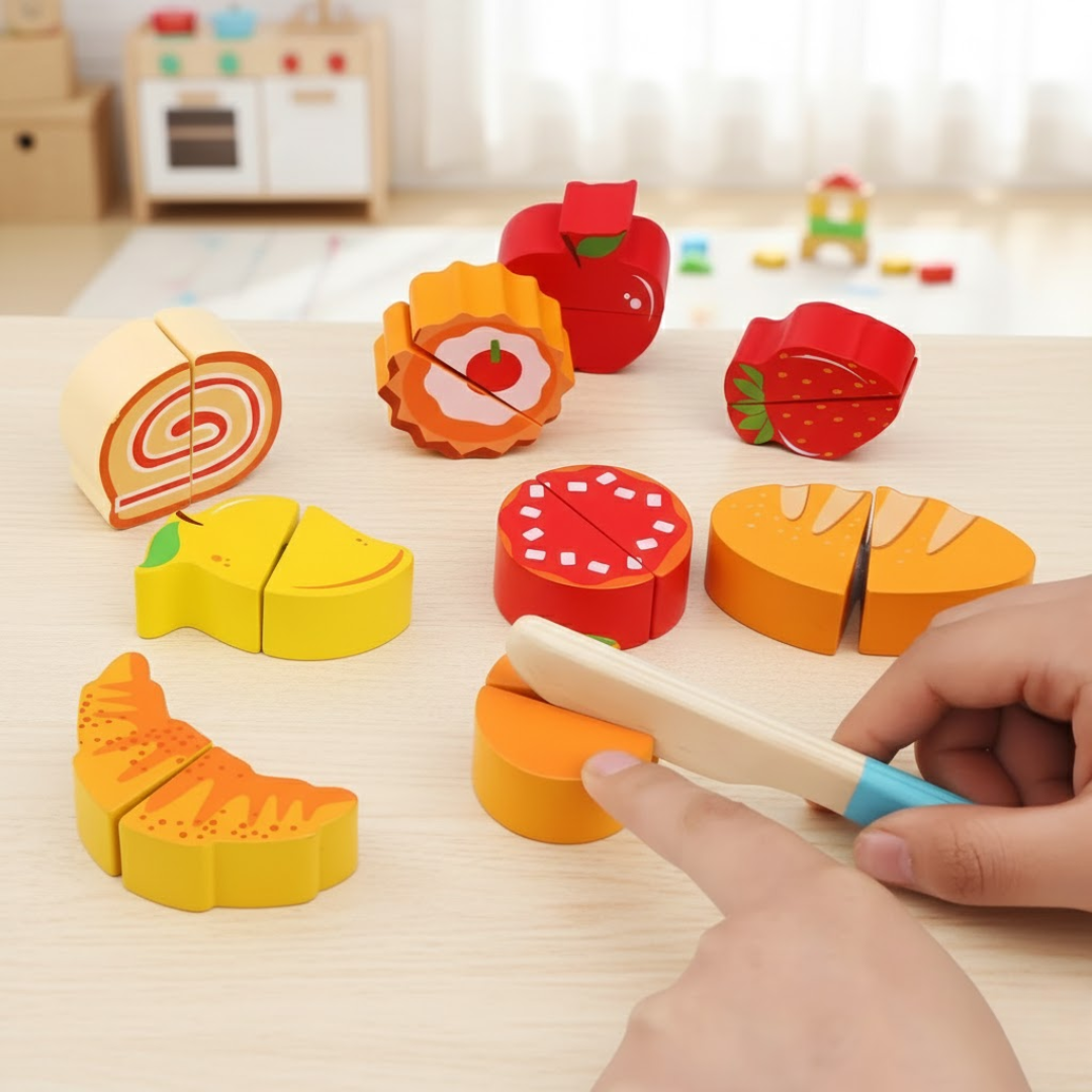 Encourages pretend grocery shopping and cooking play, helping children recognize fruits & vegetables, learn names, colors, and everyday food concepts through hands-on play.