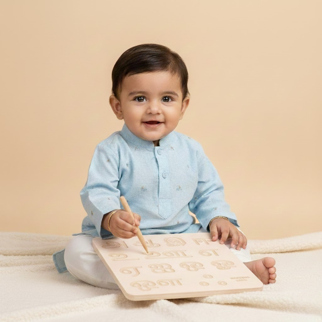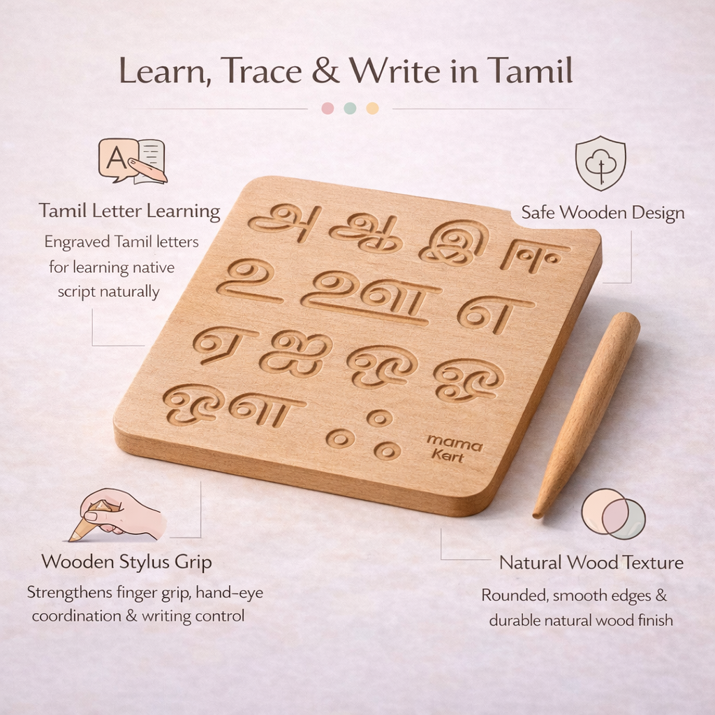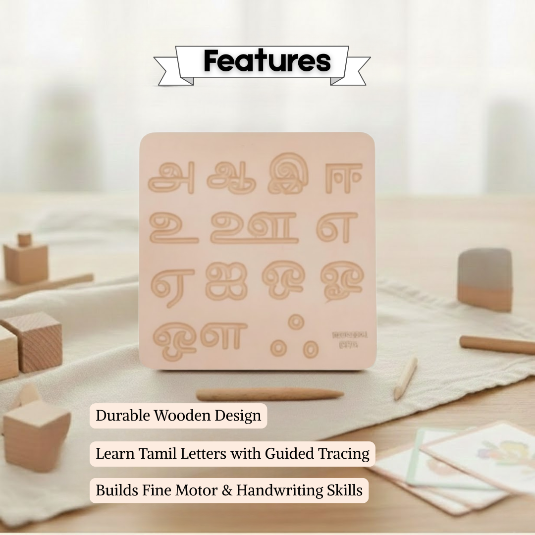 A wooden Montessori-style tracing board designed to help children learn Tamil letters through hands-on practice. Builds early literacy, finger control, and writing confidence in a fun, screen-free way.