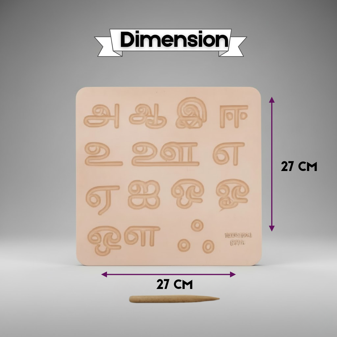 • Engraved Tamil alphabet board designed for hands-on tracing and early language learning.