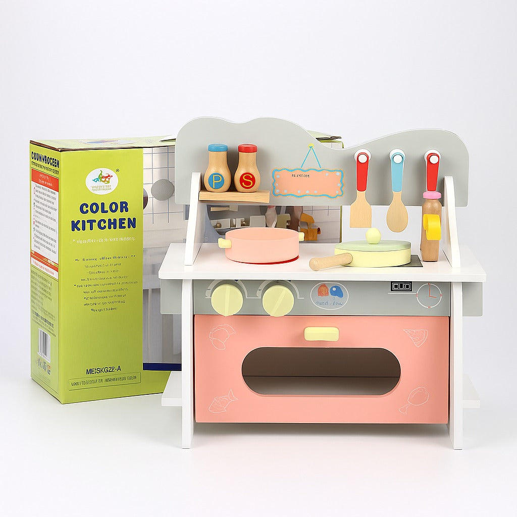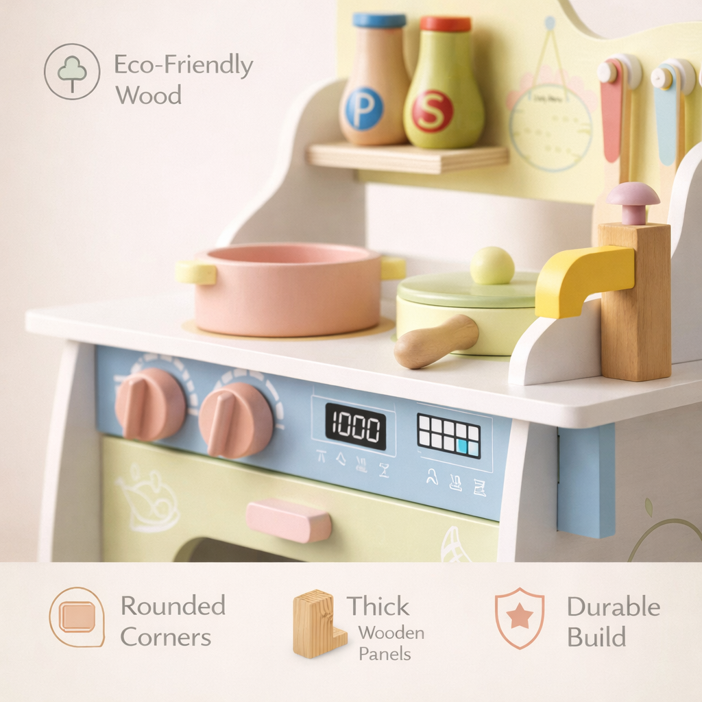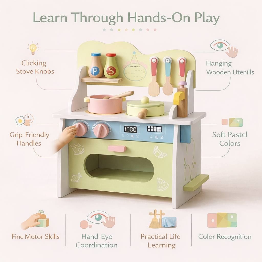 Made from child-safe, durable wood with soft colors, this kitchen encourages screen-free learning while building confidence and independence.