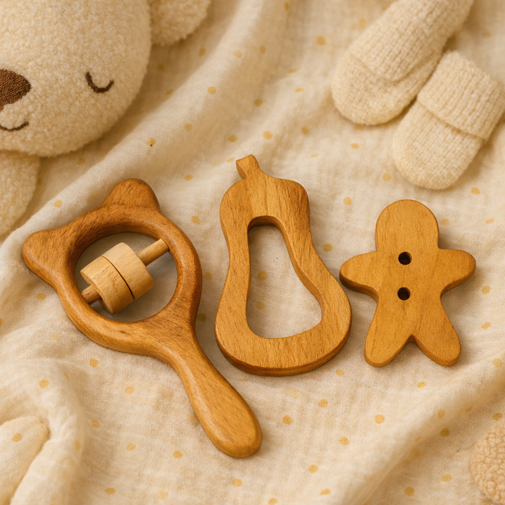 Smooth wooden shapes gently massage gums, helping relieve teething discomfort in a safe, chemical-free way.