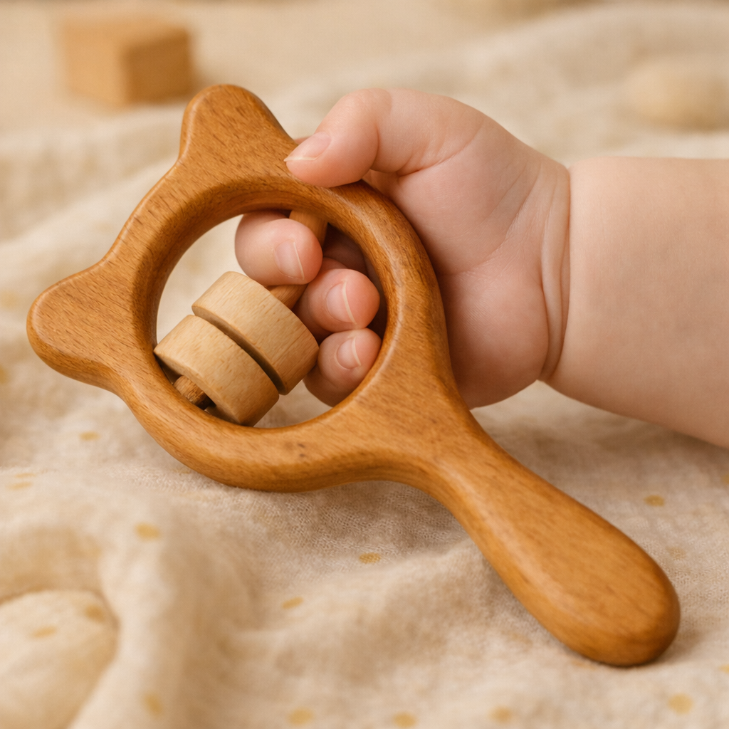 Easy-to-hold design and rolling wooden beads encourage grasping, shaking, and hand–eye coordination, supporting early motor development.