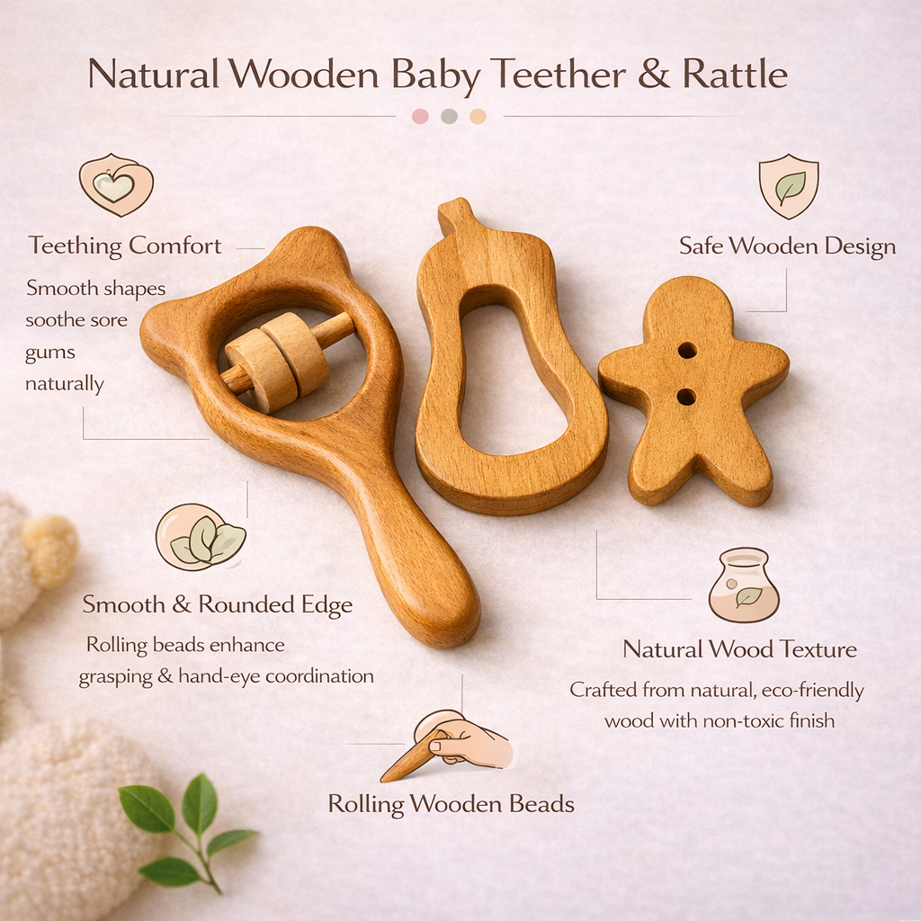Natural wooden teether & rattle set designed for tiny hands. Smooth, safe, and non-toxic, it soothes sore gums while supporting sensory exploration and fine motor development—perfect for early teething play.